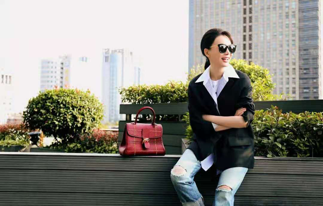 不喜欢穿裙装没关系,这件裤装的搭配同样减龄时尚。黑色的西装搭配白色的衬衫,这样经典的搭配竟然被陈数搭配的并不死板严肃,因为不管是西装还是衬衫的版型,陈数都选择的是宽大的款式,将衬衫敞开穿,内搭一件白T,多层叠穿的搭配更加时尚。下身搭配一条减龄的破洞牛仔裤,展现休闲时尚的风格。