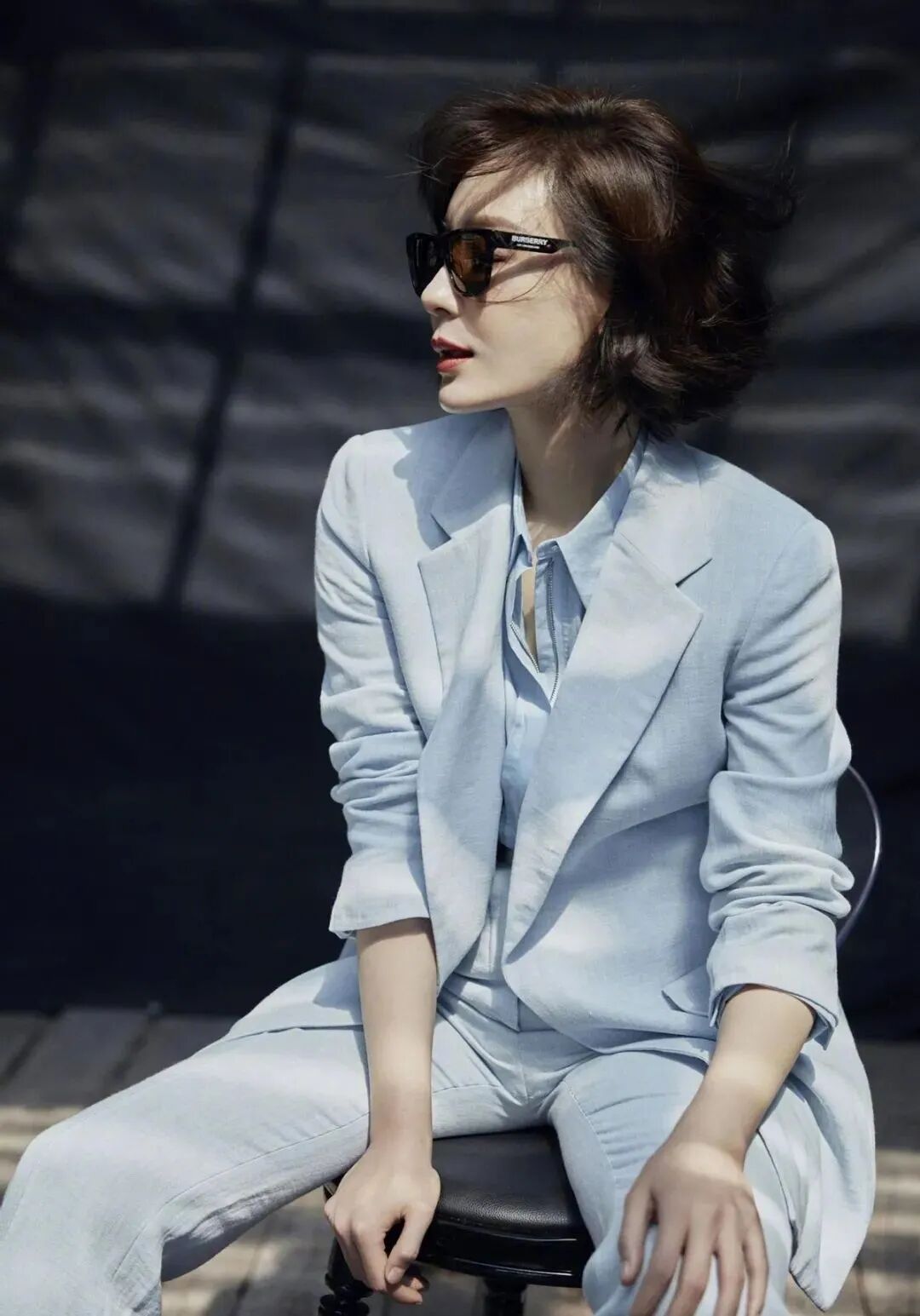 天蓝色是一个饱和度偏低的颜色,穿上之后会更显年轻活力,同时也能起到凸显面部气色的作用。从内衬到外套再到裤子,陈数全选择同个色系,整体简约不花哨,棉麻的质地让衣服有垂感更加柔和,遮肉的同时又尽显高级感。