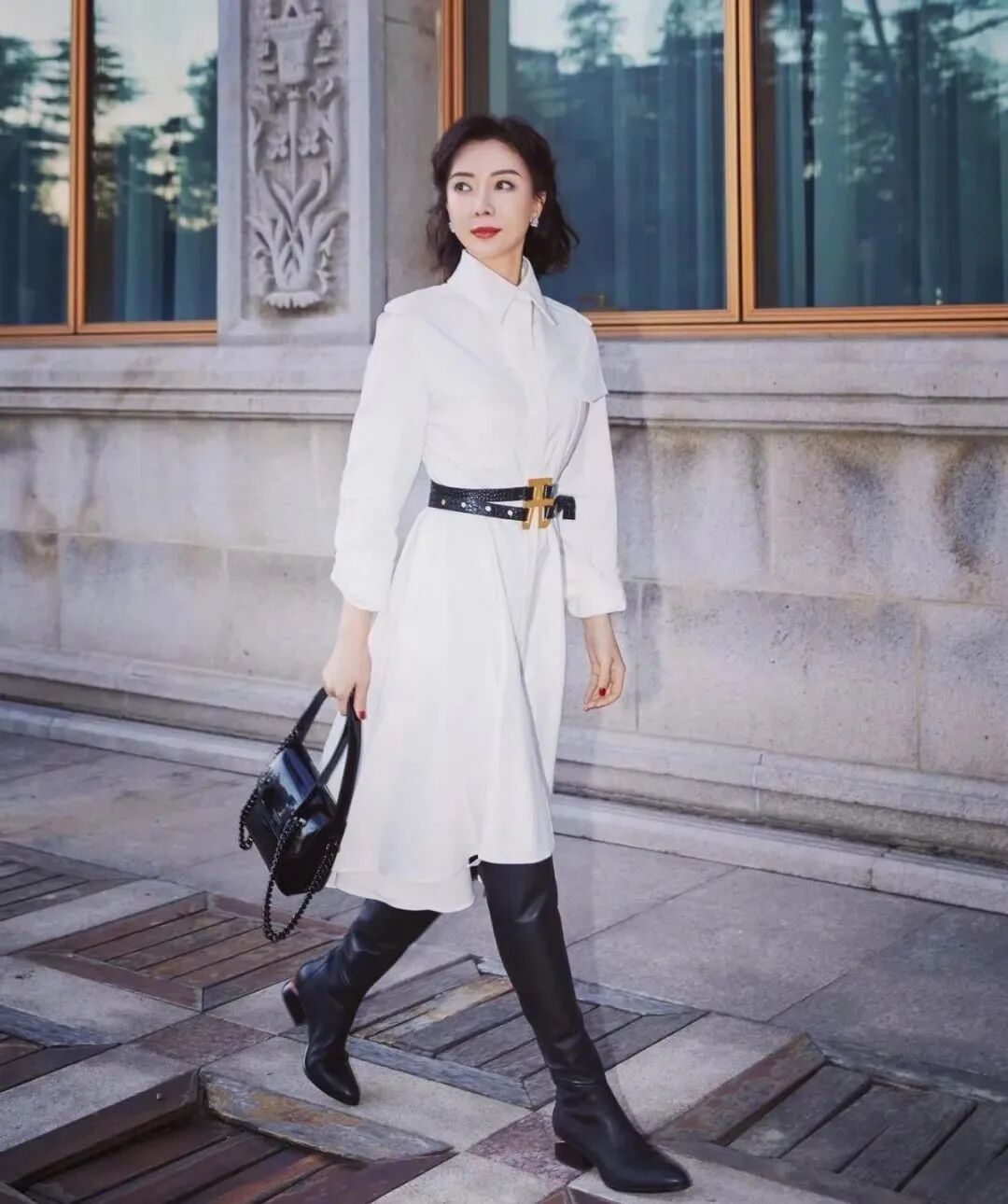 衬衫连衣裙乍看可能会显得普通无亮点,但陈数却穿出了它不一样的美。撞色的腰带,打造的是衬衫连衣裙与众不同的个性感和整体优雅大气的时尚腔调。衬衫裙本身带有质感,白色衬衫连衣裙搭配黑色金属腰封,最后搭配一双黑色皮质长靴,陈数这样穿简直太有范儿了!