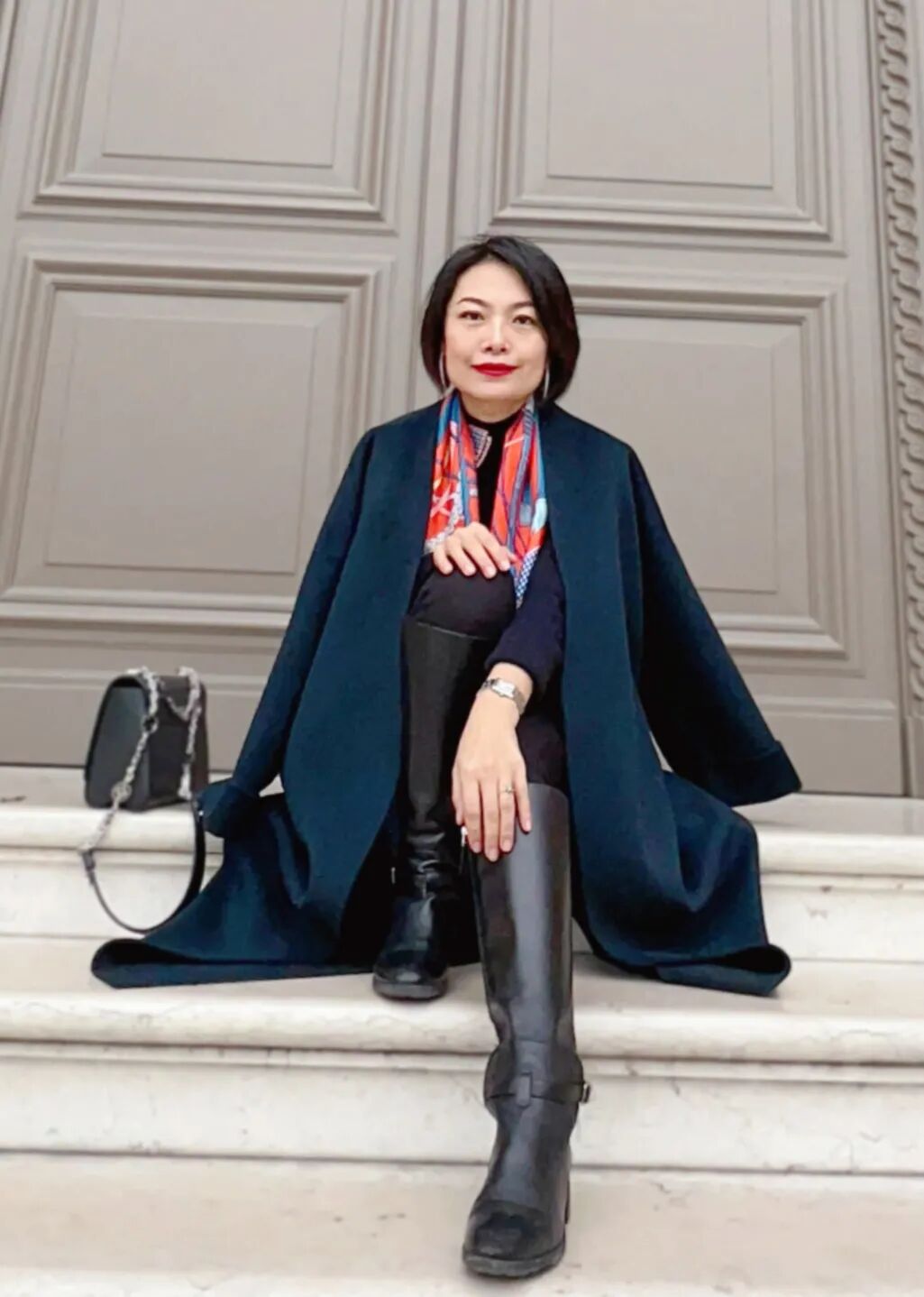 Florence Lafragette戴着贝图丝巴黎印象的丝巾