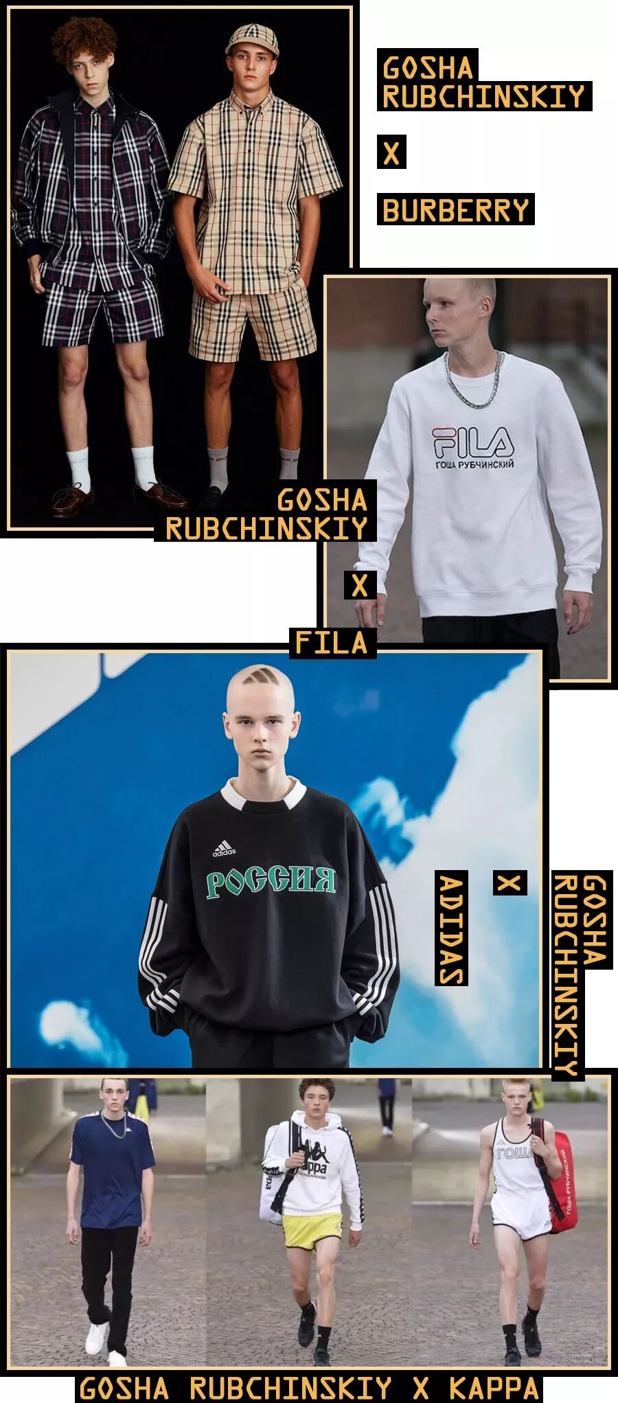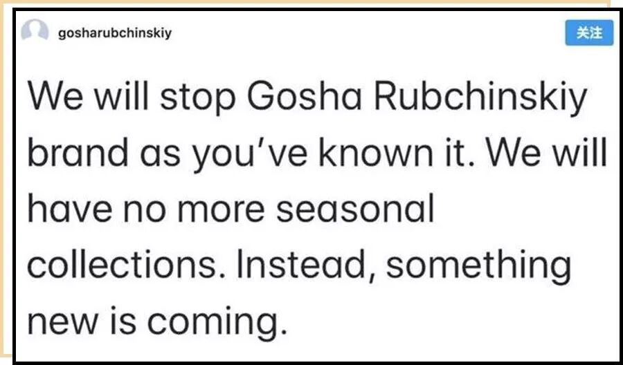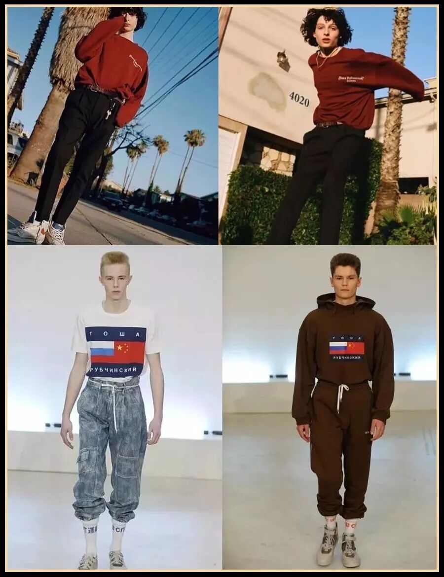 可能很多朋友没听说过这个名字,Gosha Rubchinskiy是俄罗斯的一个品牌,最标志性的设计有俄文logo卫衣、俄中国旗拼接和1984款,束脚裤扎进长筒袜里的搭配也是从这里出来的