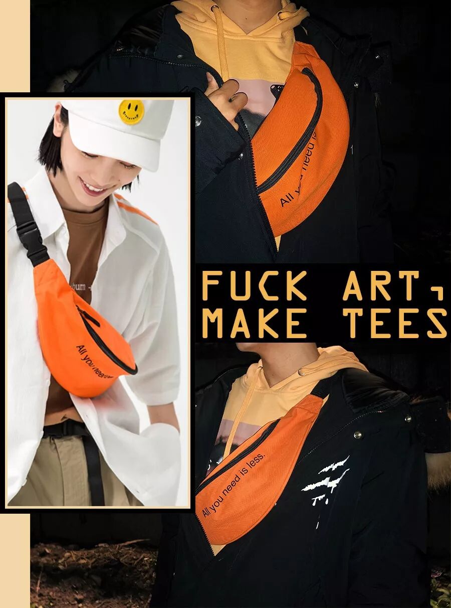 我平常和朋友出门玩不会背那种上学读书用的双肩包,一个小包装耳机零钱充电宝就行了。所以这套look我搭配的是之前说过的F.A.M.T的腰包,这个slogan我非常喜欢