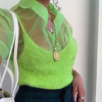 荧光绿小吊带配金属感的绿色丝质半身裙