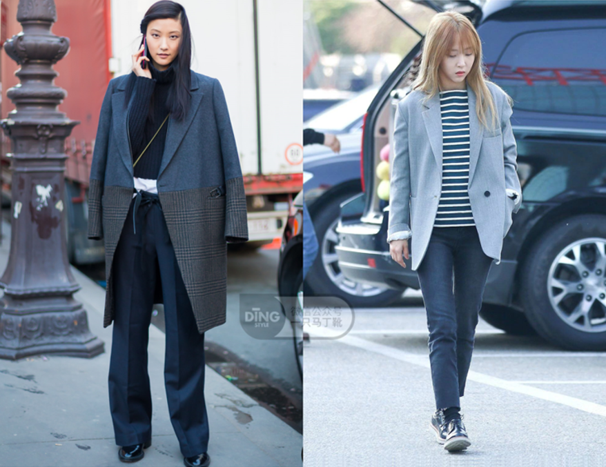 ▲右边高跟鞋+拖地阔腿裤+短内搭拉长了比例,撑出了大骨架的感觉,再穿挺括的 oversize 上衣才能撑得起来。