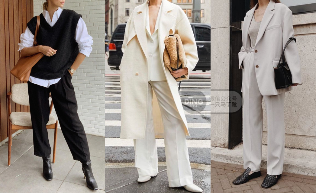 如果胸大到很难修饰,那可以考虑更暖更女性感的风格,驾驭起来也会更轻松。▍ 小骨架扁身但下半身敦实,怎么办?还有读者说过自己上半身扁、下半身圆,可能就是梨型身材了,胯部腿部的脂肪比较多,对精干利落感确实有影响。如果敦实感没那么强,可以考虑垂感直筒裤,