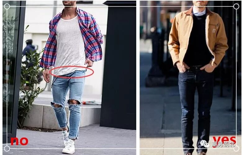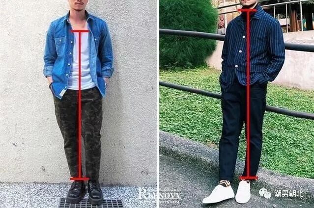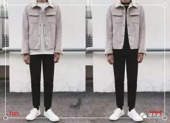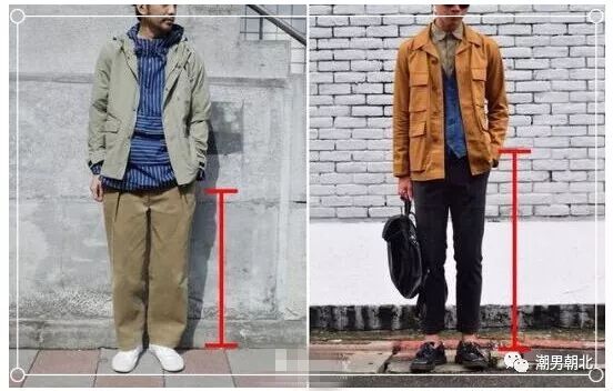 外短内长的核心点在于外套上,当你的外套衣长是比较短的时候(短过腰),那么这时候你可以在内搭衣长上放短一点点,如果这时候你是想穿跟外套一样那么短的内搭,那么内搭的颜色要跟下身同色或者是相近色,不然就会出现跟左图中的那样,本来整个人都比较矮小的了,这样穿搭会被划分为很多节,对个子小的男生来说是灾难。