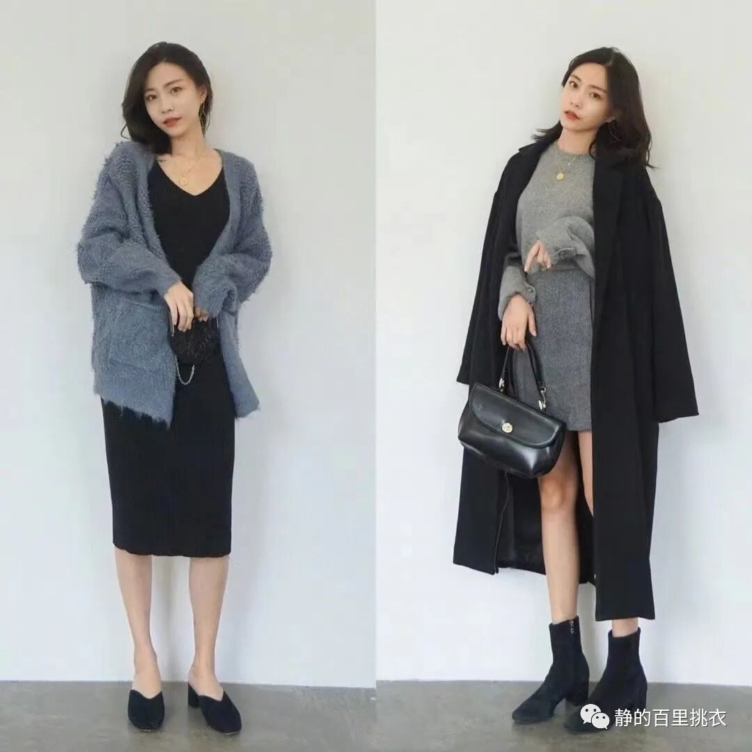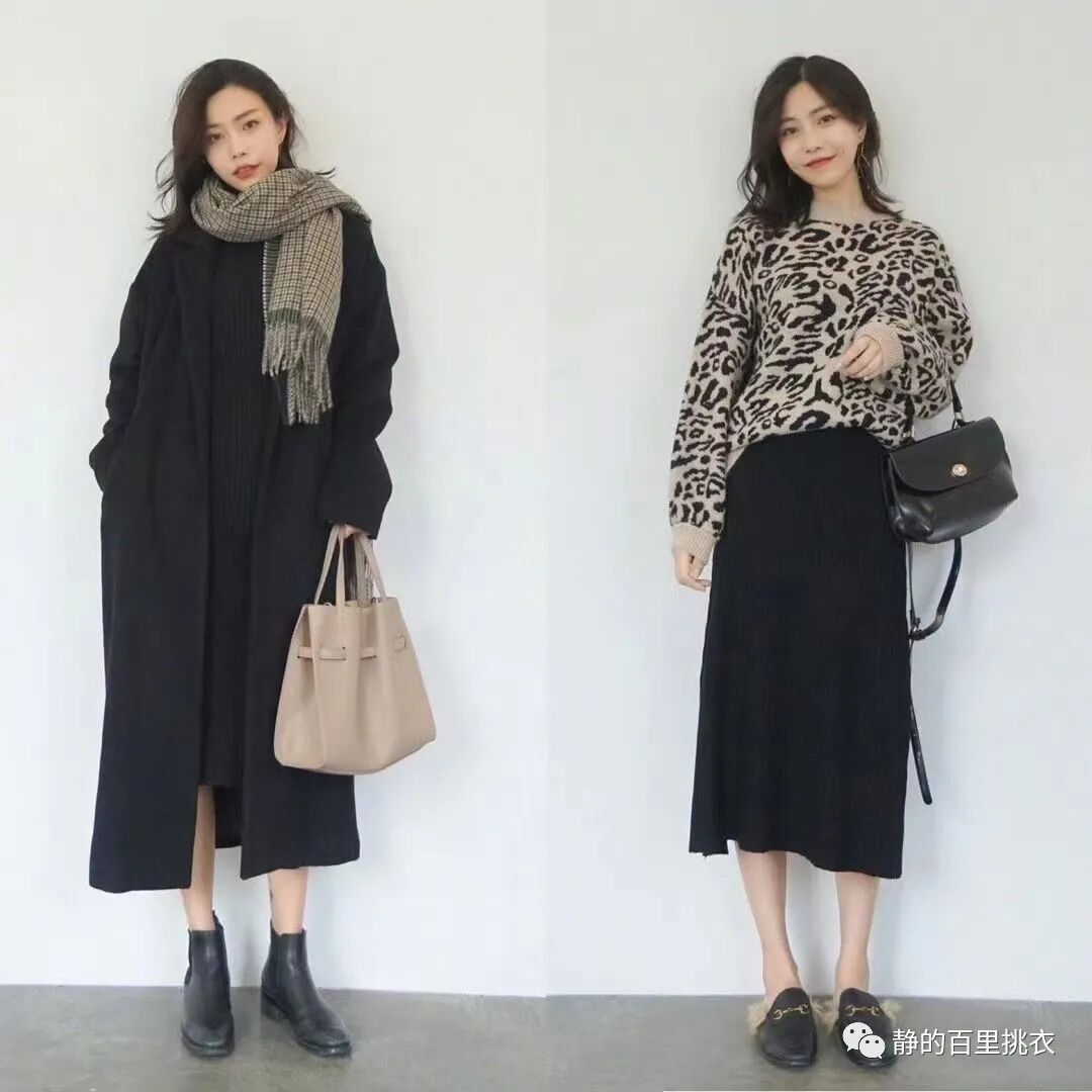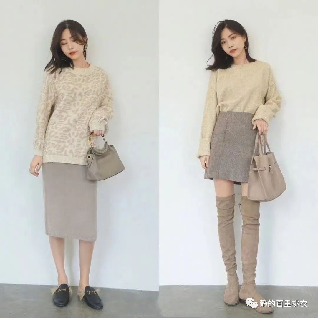 上短下长的穿搭技巧也很适用于半身裙,简约大气的长款过膝半身裙,上衣搭配一件短款的针织毛衣,日常且优雅。