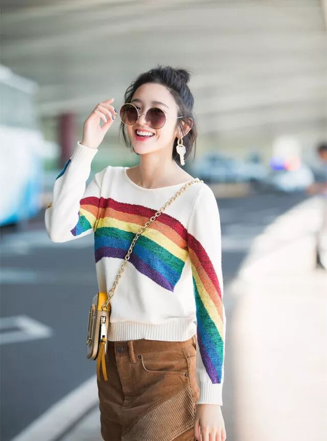 唐艺昕这般元气少女最能驾驭这种色彩缤纷系列,先前穿Marc Jacobs的彩虹条纹毛衣征战时装周,简单而活泼可爱,丝毫没有其她女明星的野心劲儿。