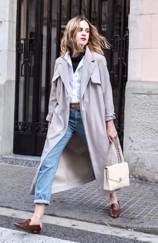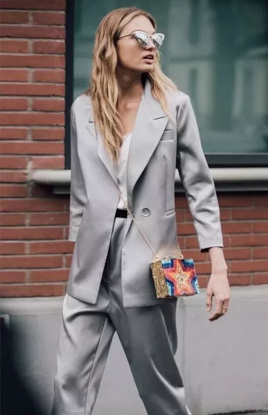 介于黑色和白色之间的灰色调,则更能烘托出chic girl简约大气的迷人气质。不怕冷的话可以pick一些材质轻盈的风衣/吸烟装,干净又利落。