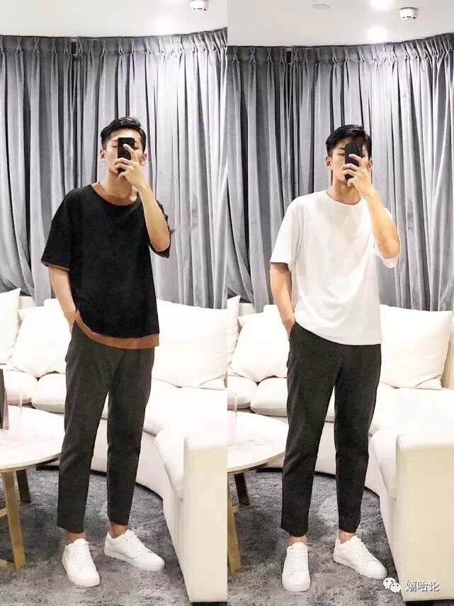 宽松圆领白T黑色九分休闲裤小白鞋