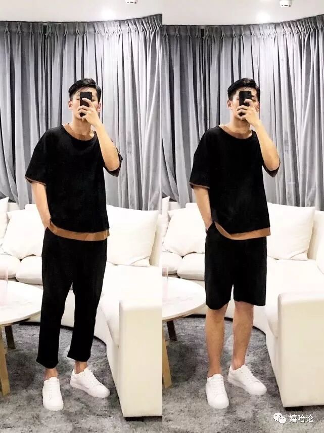 宽松拼色T恤黑色五分短裤小白鞋