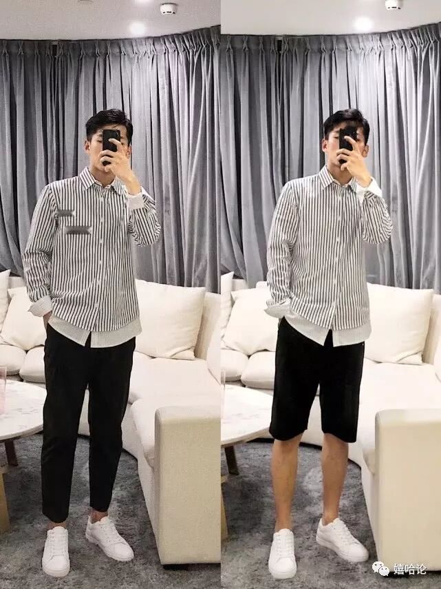 拼接条纹衬衫黑色五分短裤小白鞋