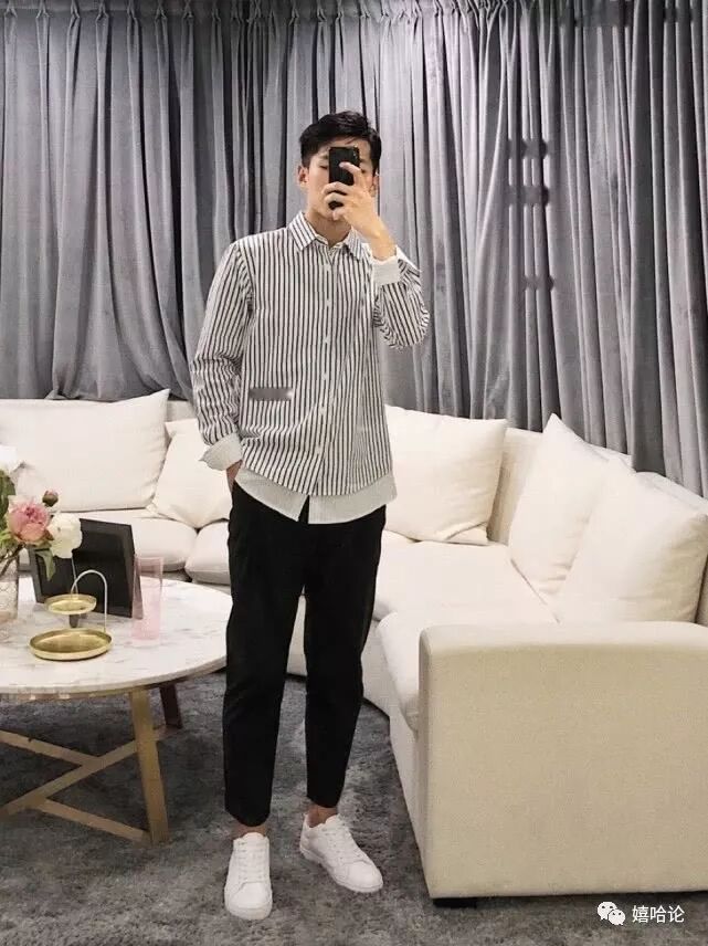 图2拼接条纹衬衫黑色九分休闲裤小白鞋