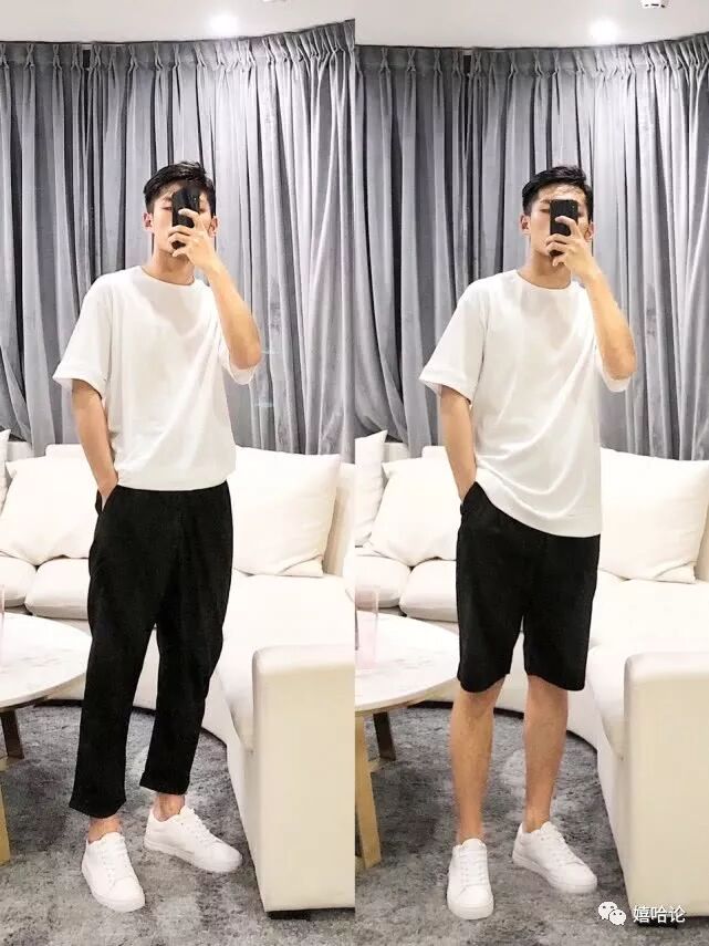宽松圆领白T黑色五分短裤小白鞋