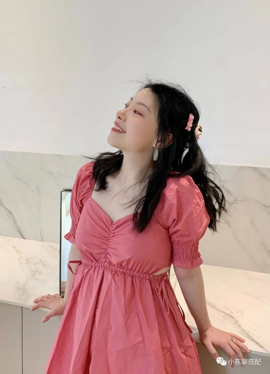 想要拥有修长脖颈线,不妨学习一花博主穿搭小平领款的仙女裙,延长脖颈线条。一般人体锁骨区域不易堆积脂肪,因此这个区域并不会有太多的肉感,穿搭小平领款裙装,将脖颈衔接锁骨区域,给予脖颈区域更多的空白,不至于被服装束缚住。加上平领棱线感强烈,也会带来一定的显瘦效果。