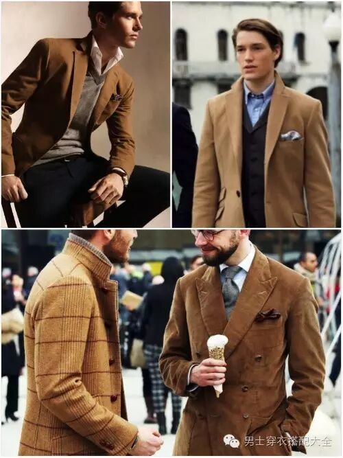 驼色灯芯绒可能比较难驾驭,先推荐上面两种款式,如果还想再购入第三种款式增加变化就可以选择带有老学究感的驼色款式,这样的西装外套带有英伦传统绅士的味道,但是加上一些配件也可以变得很有趣,选择上要注意腰部线条的剪裁,因为布料的关系容易显胖。