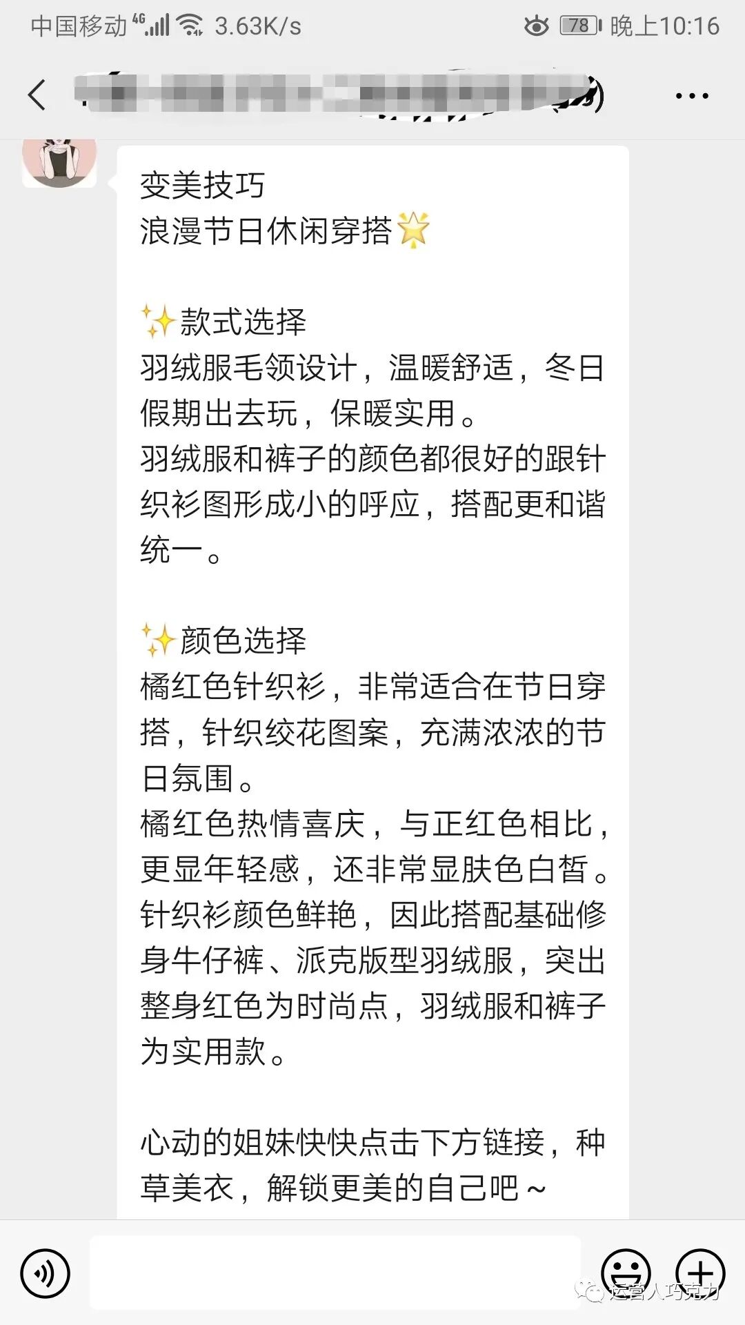 1)同好社群主题内容为衣服的穿搭技巧。平台主要是做女装的,在加上有自己的专业的搭配师。社群内容主要是衣服的穿搭内容,社群主要内容包括女性体型、肤色、颜色搭配等方面的内容。设置为这一块的内容,更能体现出维护用户的口碑和体现平台的价值属性。社群内容主要是平台属性决定的。作为客户进群,主要是学习穿搭内容,这便是“同好”属性。
