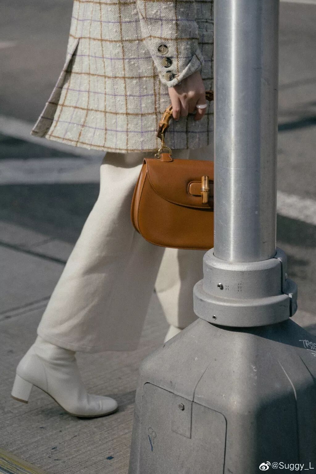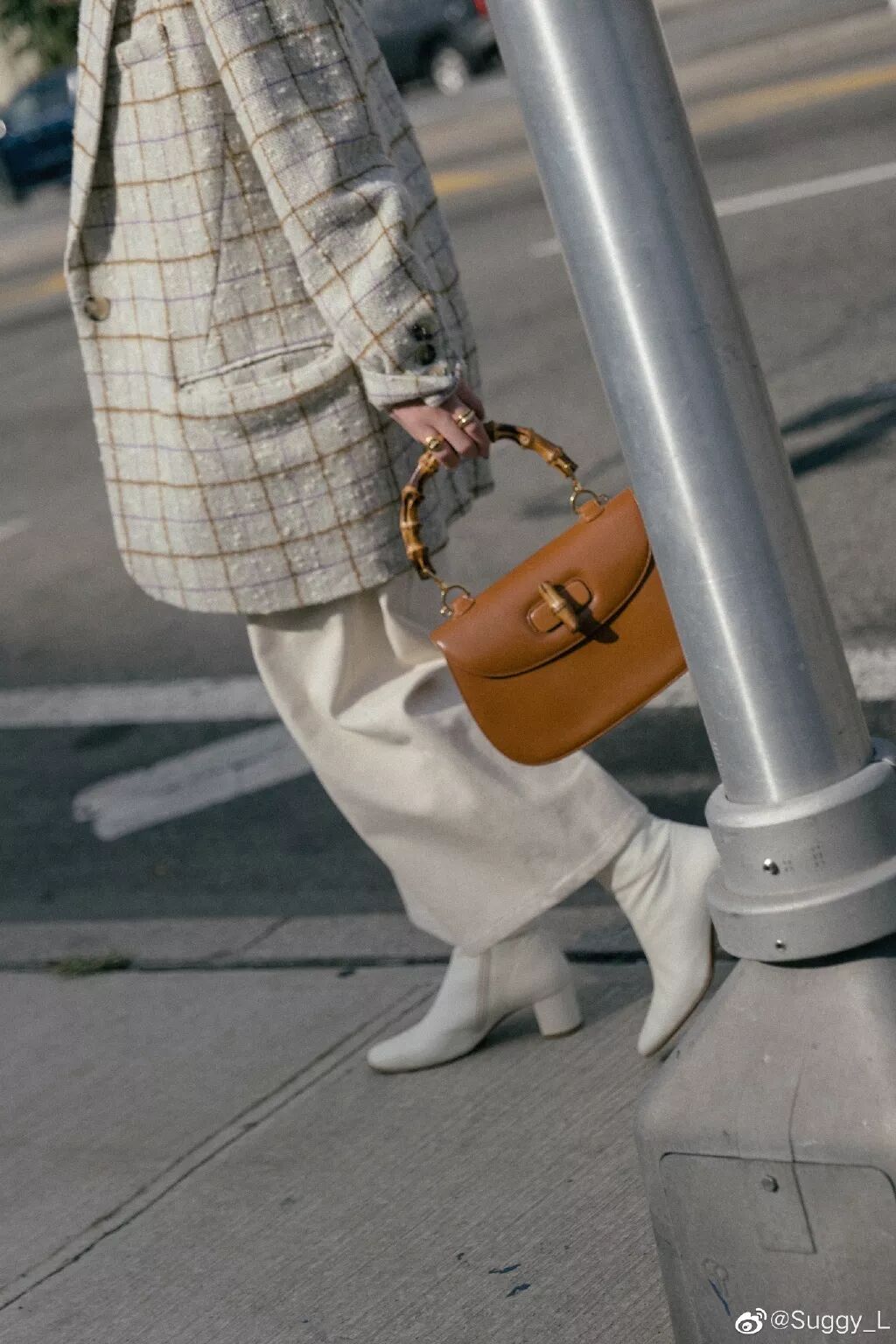 整体的色调轻微偏绿色,但是格纹是紫色加棕色,很有趣复古的配色,跟这套穿搭其他的单品可以融合的很好,包包上想要区别其他颜色有个点缀所以选择了棕色,是一个包型很复古的中古Gucci提包。