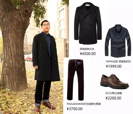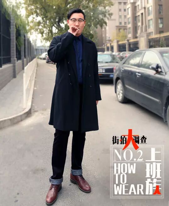 在听到这句话时我是崩溃的,原来他的穿衣经就是让女朋友搭配。好吧,不得不说,他的女朋友还真会搭!深色大衣搭深蓝色修身衬衫、暗红色灯芯绒长裤和深红色经典皮鞋,整体造型文艺而雅痞。这位帅哥给我的第一眼感觉是痞,但他坦言自己其实很文艺。他的女朋友则将雅痞和文艺这两种性格巧妙地融入到一套look里,真的很用心。