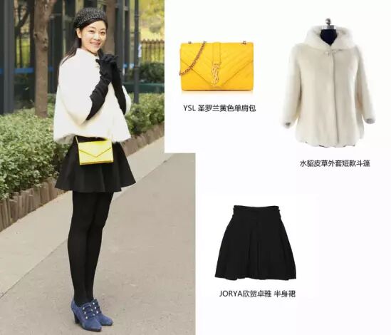 与前面两套简约摩登的造型不同,第三套look大玩民国风,深灰色贝雷帽文艺复古,纯白皮草斗篷轻松活泼,搭配黑色小伞裙,淑女而不呆板。YSL圣罗兰黄色单肩包为整套造型画上点睛之笔。厌倦了每日无聊的工作,不妨来一场穿越民国的旅行。