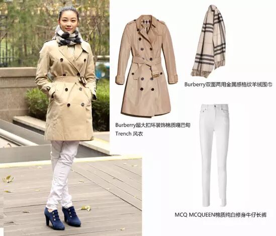 第二套look选择了Burberry经典trench长款风衣,搭配MCQ MCQUEEN牛仔长裤,配饰上选择了Burberry格纹羊绒围巾,整体造型摩登、硬朗而锋利。在这个秋风瑟瑟的季节里,与模特自身清冷的气质发生了微妙的化学反应,倒是别有一番风味。