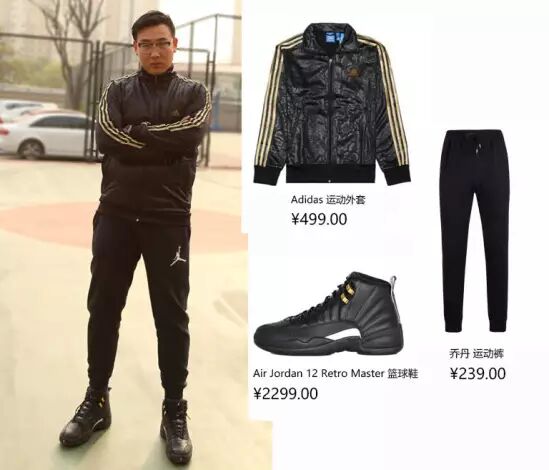 第三套look则尽显了他运动张扬的本性,Adidas运动外套搭乔丹运动裤和限量版Air Jordan12金扣球鞋,篮球boy的形象跃然而起。
