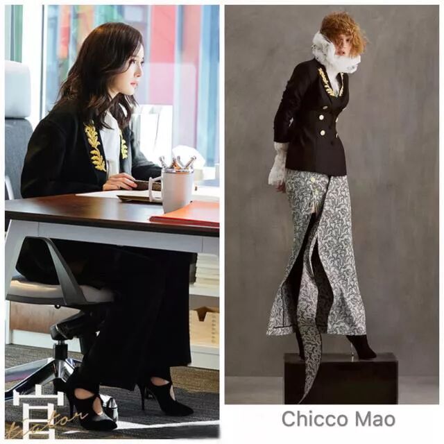 这次,造型师在传统黑白职业装的外套中为大幂幂加入了荷叶边、碎花等女性化元素,整体感觉更柔和。
