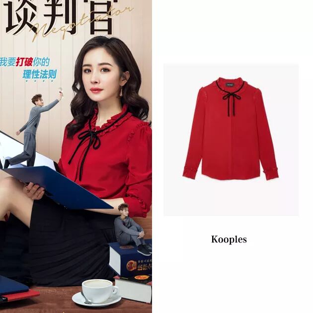 海报上大幂幂跳出传统框架,选择了大红色的衬衫搭配黑色半裙,红黑的色彩搭配带来的视觉强悍不会比黑白带来的少,而且有心机的在领口选择蝴蝶结装饰。