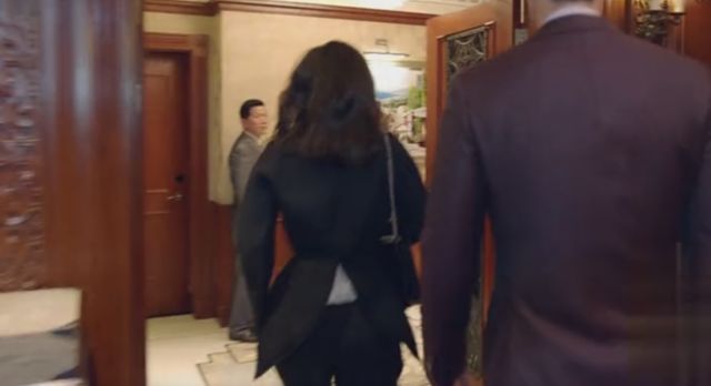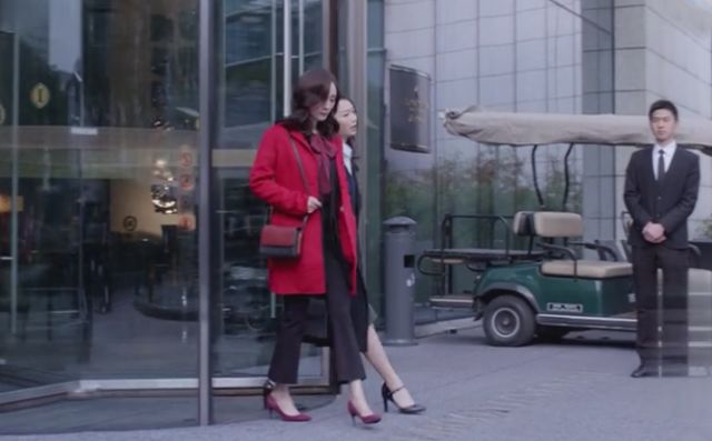在第一次去谢晓飞下榻的酒店是,大幂幂是直接从公司出发的,大衣的里面还是在公司里穿的黑西装+酒红衬衫,外套和衬衫颜色统一,红色包包和高跟鞋做点缀。微喇叭裤可以很好的修饰小腿的腿型,想要更显高可以学大幂幂这样露脚踝(不怕冷的话)!