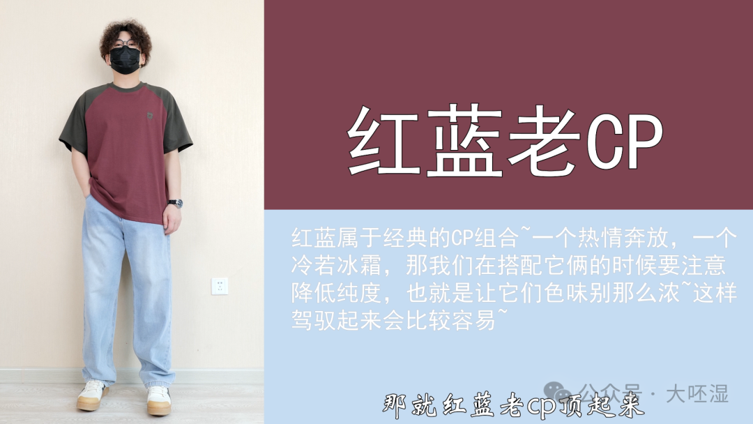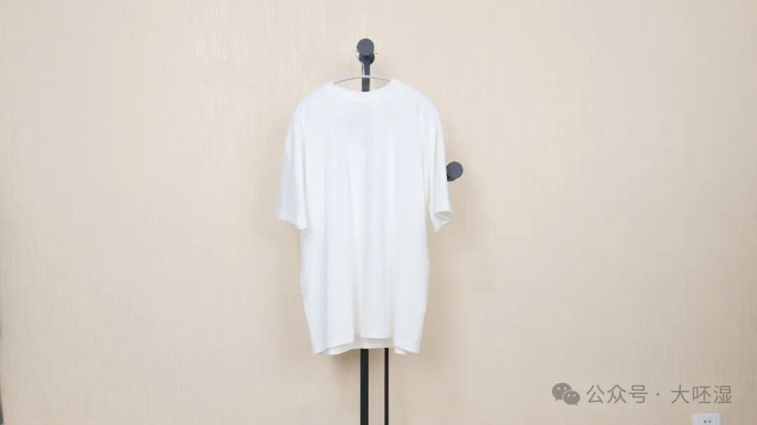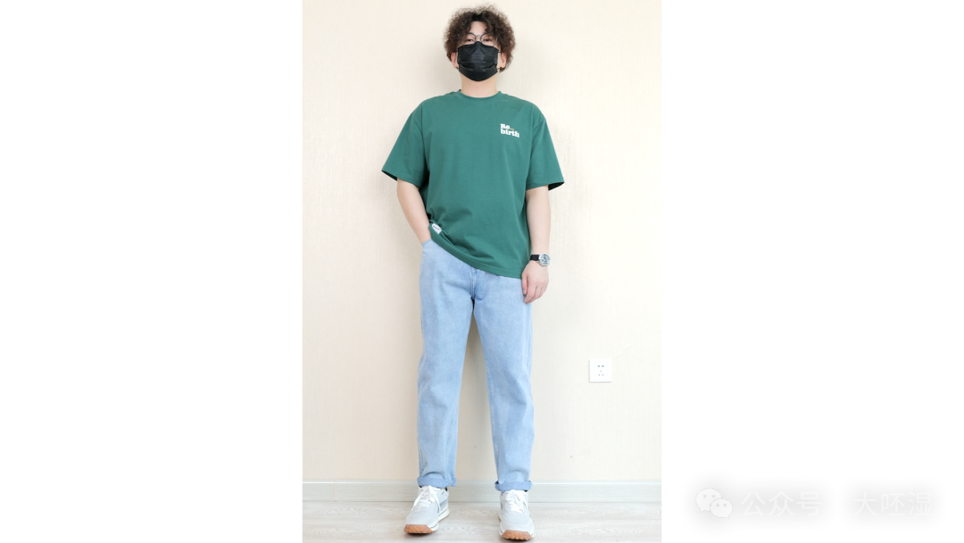 详解:这个T恤比较宽松,下摆不长,整体穿上比较有松弛感,也符合简约风格的定位,简约风格咱们不能搞贼紧那种,效果不理想。然后它面料是棉+索罗那,比较舒服,垂感也OK