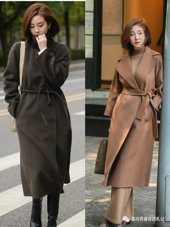 小个子女生在搭配大衣时一定要注意版型的选择,袖口、肩膀、以及腰部的设计如果太过繁复,就会减少视觉上的身高比例。比如图中两款收大衣,收腰的版型对身高有一定要求,于此同时版型偏向于包裹,对于小个子的姐妹来说容易显壮。
