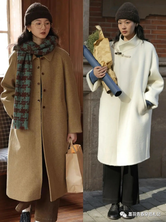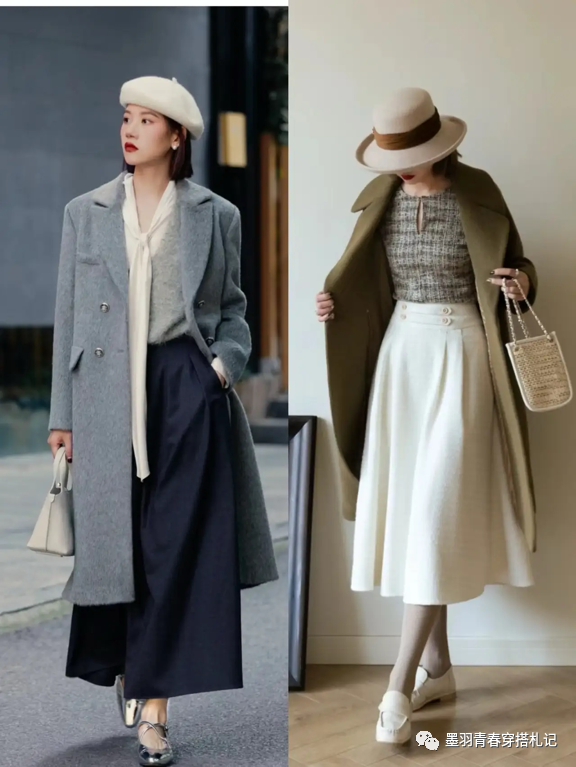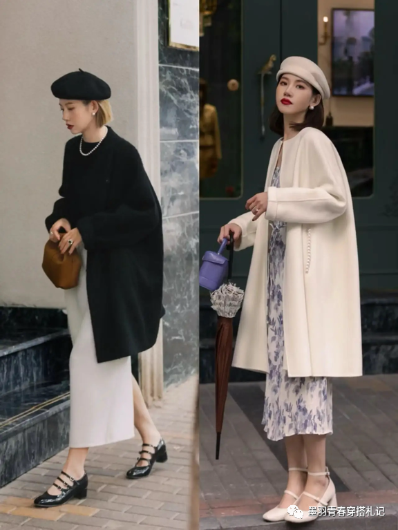 小个子姐妹在搭配长大衣时,适当加入一些复古风格的配饰,会让整个造型更加洋气,凸显高级古典气质。比如黑色中长款羊绒大衣,搭配白色复古直筒半裙和绑带粗跟玛丽珍鞋,干净的黑白配色+绑带鞋、珍珠项链、贝雷帽等元素体现出冬日的治愈感和优雅的气质,右边则选择白色外套+浅紫色印花连衣裙和复古风格的粗跟玛丽珍给人白皙、贵气的印象。
