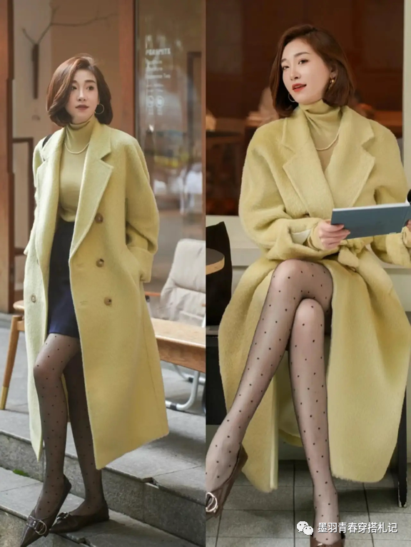 姜黄色长款羊绒大衣,搭配同色系的薄款针织打底和深灰色包臀裙,阔边的长大衣+利落的短裙,会让轮廓更加干净清爽,搭配丝袜造型和尖头浅口单鞋体现出妩媚优雅的女人味。