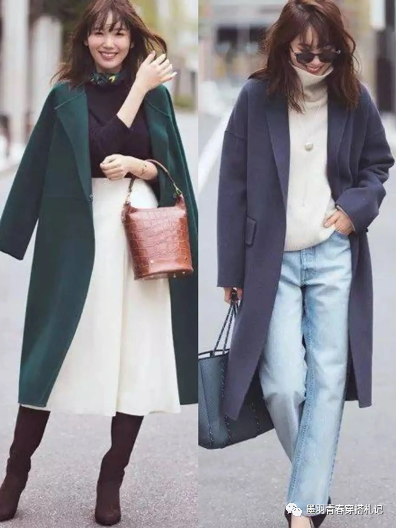 小个子的姐妹搭配长大衣时要注意打底的厚度,轻便的纯色羊绒打底不仅能够拉长颈肩线条,还可以避免造型上的臃肿感,军绿色长款羊绒大衣,搭配黑色薄款打底和米白色高腰西装伞裙,高腰伞裙轻松藏住腰腹部的肉肉+增强线条的干净度,右边选择灰色长大衣+米色高领针织和水洗蓝牛仔休闲裤,清透又自然。