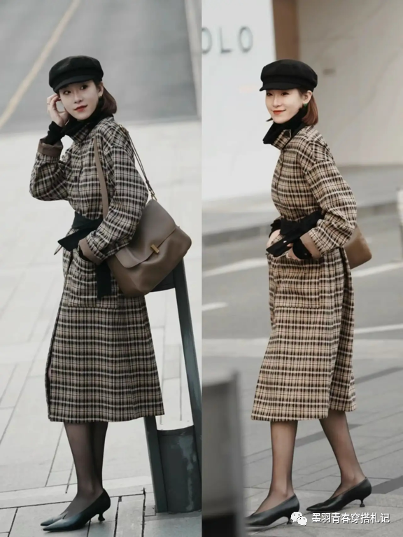 深棕色细格纹收腰长大衣+黑色尖头细高跟和同色系的配饰,优雅复古的格纹可以有效修饰造型轮廓,加上黑色腰带和帽子的加持,突出苗条锐利的线条感。