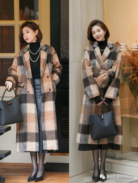 相反的,小个子的姐妹选择垂感不错的直筒大衣则能够体现出舒展轻盈的状态,浅棕色格纹毛衣直筒风衣+黑色针织打底和灰色半裙,淡淡的浅棕与几何色块的搭配,有效优化了身形线条,松弛的轮廓体现出从容活跃的状态。
