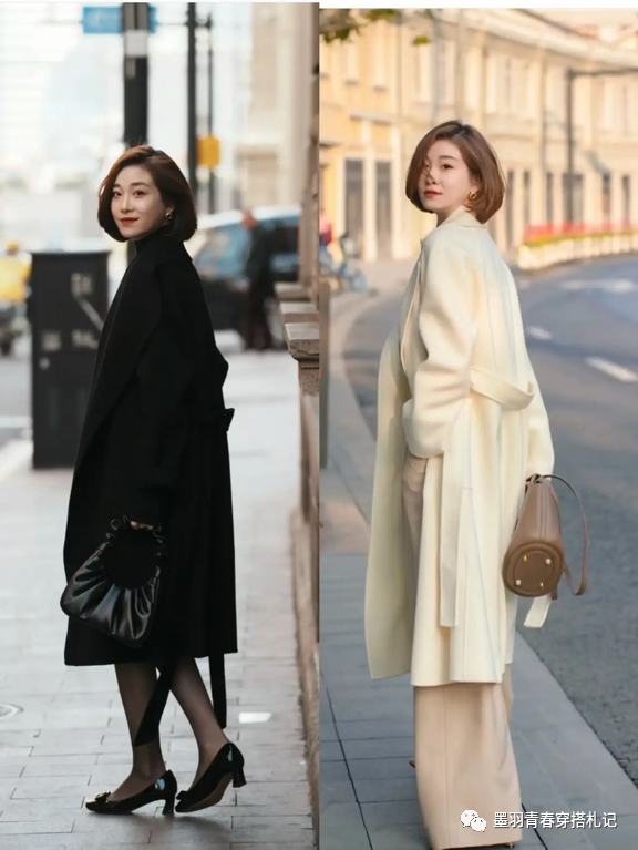 黑色长款羊绒大衣,搭配同色系的军绿色打底和漆皮感尖头细跟鞋,华丽的黑色能够突出职场女性优雅、精致的内在特质,鞋子和包包同色系的搭配,增添细节的精致感,右边选择米白色长款大衣+浅驼色高腰西装阔腿裤和水桶包知性大方。