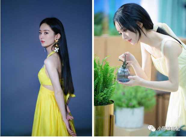 但色彩选择也要注意,不要选择对肤色不友好的,不然反而会拉跨精气神和气质。像这组对比就比较明显,赵丽颖不是天生的冷白皮,选择这种比较鲜艳的黄就有点踩雷了,相较下来,左边的淡黄色会更出彩。