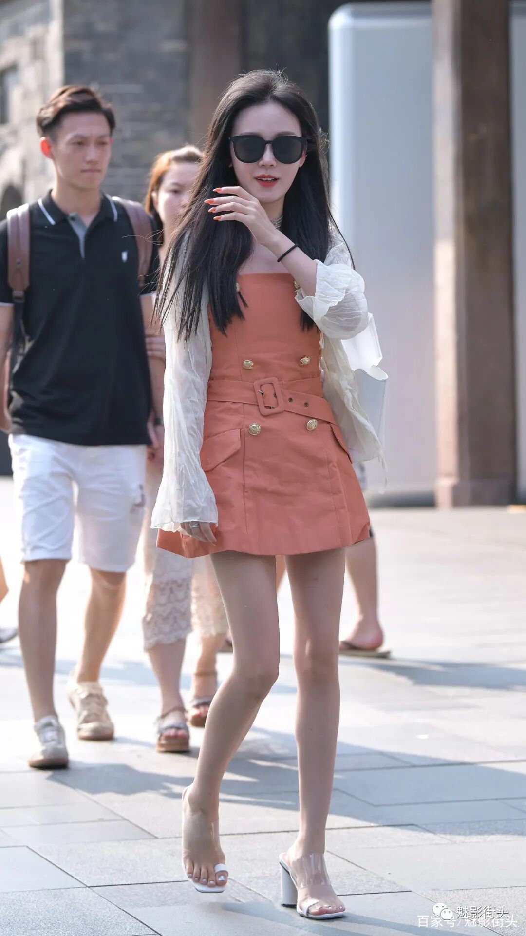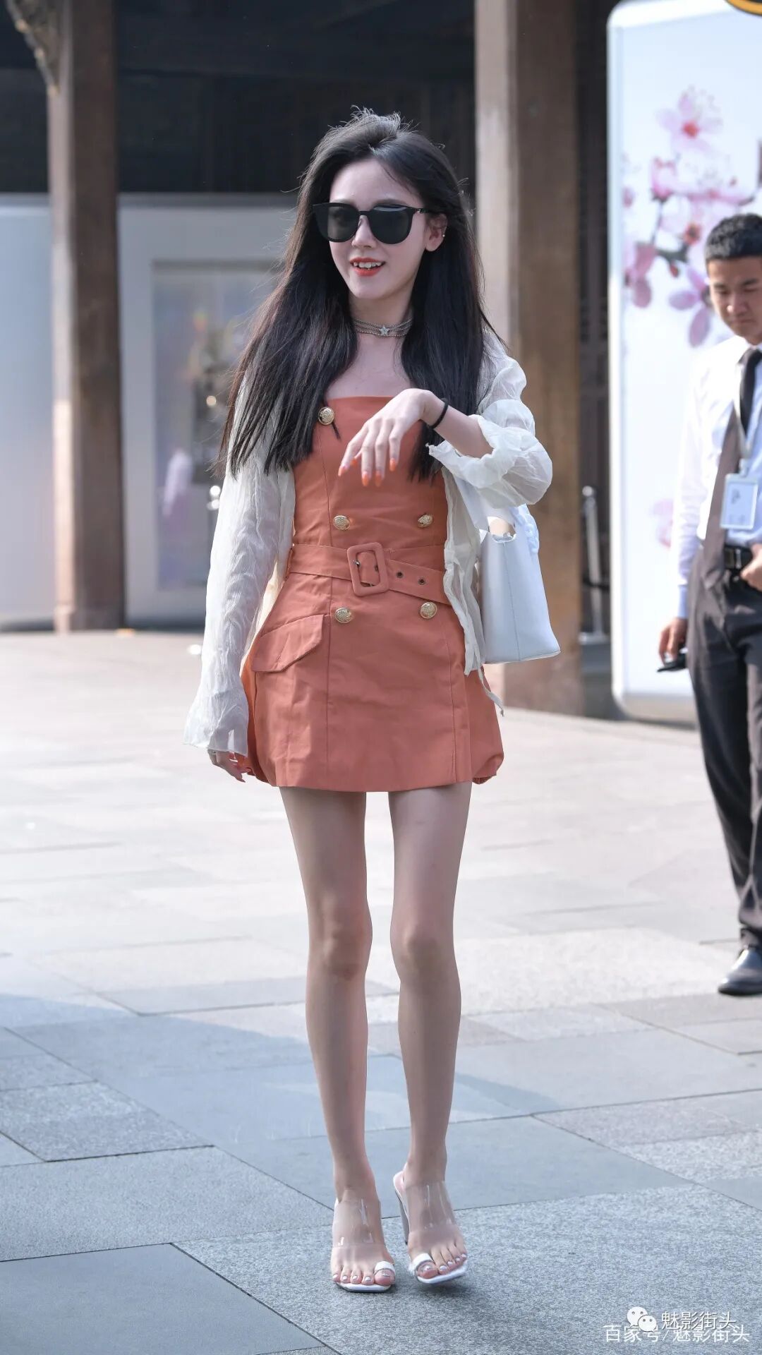 做好防晒工作可以对皮肤起到美白效果,长时间地照射紫外线会导致皮肤黑色素沉积,让皮肤变黑,对于女生来说“一白遮百丑”才是最有效地扮美方式。看下这个美女,她选择了一条橘色连衣裙,抹胸设计露出肩背部的皮肤可以打造性感气质,增添女性魅力。美女搭配了一件白色防晒衣,颜色搭配很有层次感,脚下一双白色高跟凉拖鞋,衬托出高挑挺拔的身材。美女这身搭配利用防晒衣来增加防晒效果,加上适度的露肤,确实有着非常出色的好衣品。