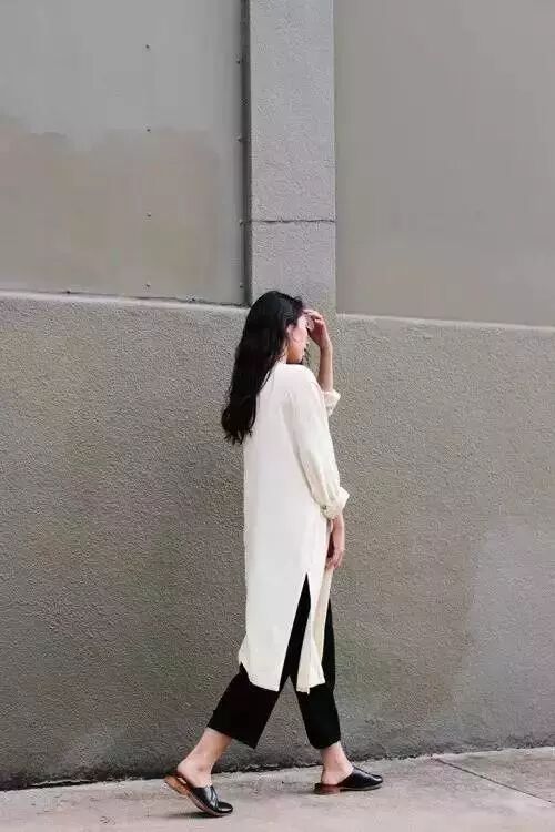 喜欢极简风格的姑娘肯定也必备一件长款衬衫,开叉设计让衬衫看起来更加飘逸。