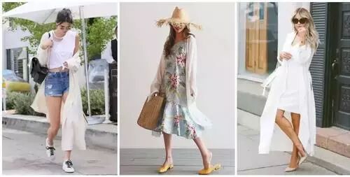 两年来流行的睡衣风,到了夏季,我们就看到了不少“睡袍风”,丝质的镶边睡袍成了很多明星们的热门选项,时髦又不会觉得热。