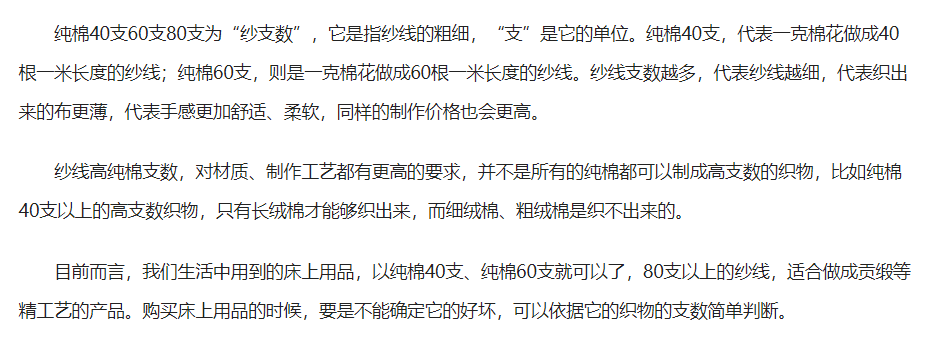 在日常生活中除了有60支之外,还有21支、32支、40支、50支等等,但支数越大其织物就会越密并且越柔软。