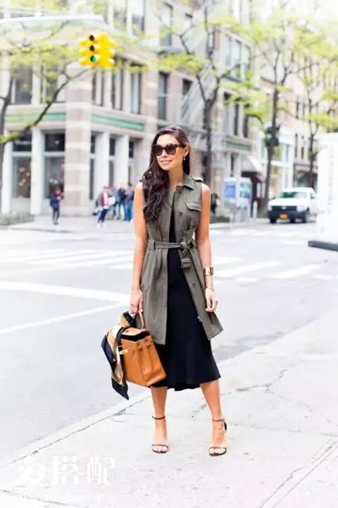 春季穿连衣裙有点hold不住,可以在连衣裙外面搭配一件卡其色的无袖风衣。