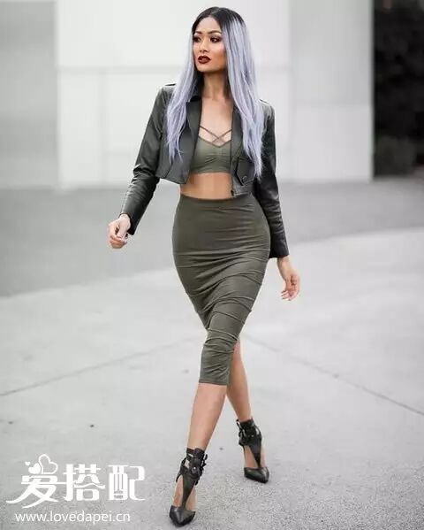 全身卡其色穿搭也是比较流行的搭配,像这样一件卡其色短皮夹克搭配运动bra和包臀裙,优雅而性感的S曲线很撩人。
