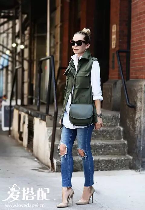 牛仔裤和白衬衫都属于基础单品,但是加上一件深卡其色的背心外套,一些都变得高级起来。