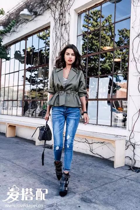 一件卡其色的收腰小西服,搭配牛仔裤,给你小巧而精致的优雅感。