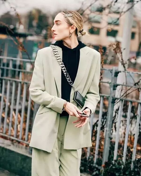蓝+灰+白是任何时候都经典,也不会出错的配色,总之怎么搭配都好看啦~另外今年比较流行链条短一些的斜挎包,可以让视觉重心上移哦,起到显高的作