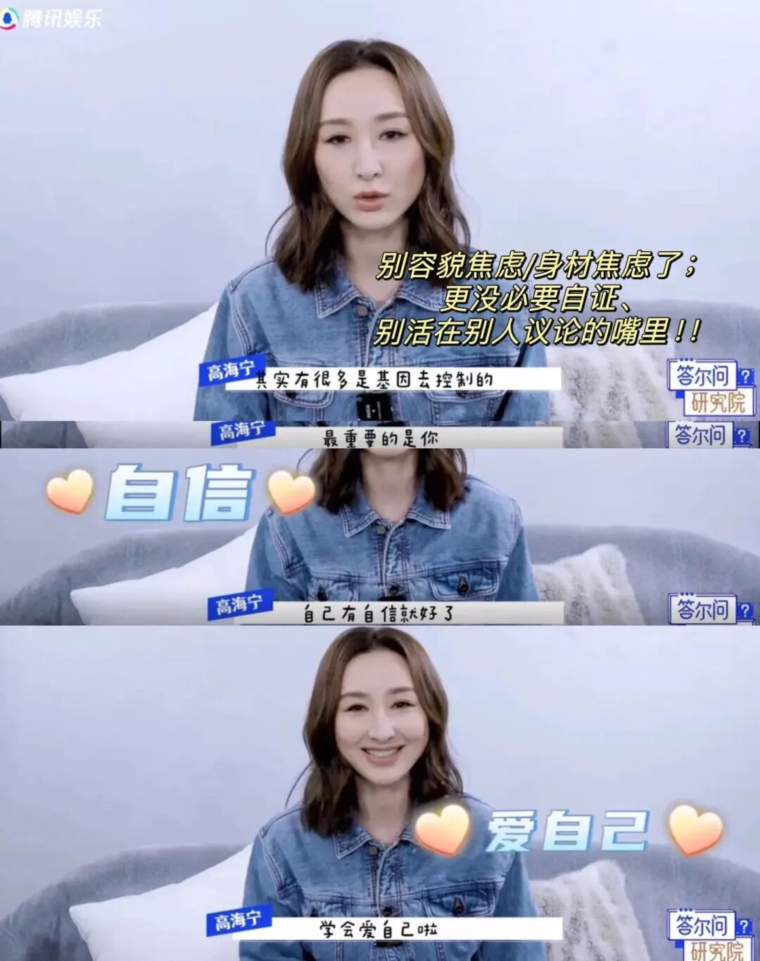 高海宁是直到30+才学会不活在别人嘴里+停止自证的。明明是用自己的能力挣干净钱,为啥要因为闲杂人等的乱说而挺不起腰板、接纳不了自己呢?甚至还要反复内耗、一度抑郁......