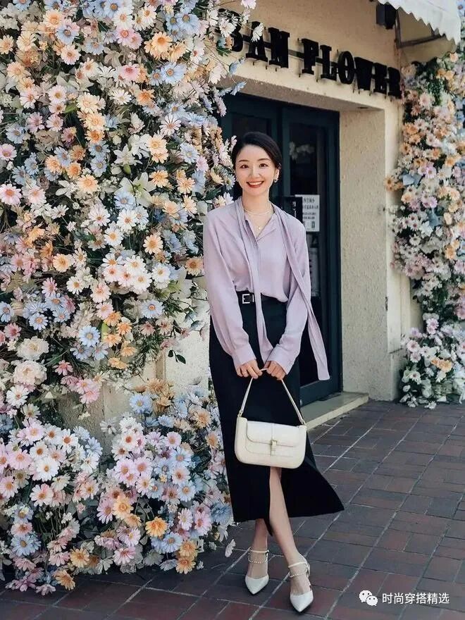 衬衫搭配半裙紫色衬衫轻盈飘逸,飘带细腻流动,犹如一首优雅的音乐。黑色直筒超短裙勾勒出女性婀娜多姿的身姿,搭配白色高跟鞋,更显迷人风采。飘带随风轻摆,仿佛诉说着内心的自由和梦想。