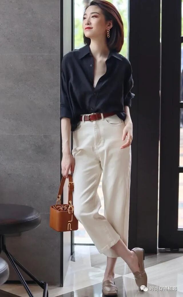衬衫搭配牛仔裤白色衬衫和牛仔裤的组合永远不会过时,它们一起诠释了一种自由自信的生活态度。卷起裤子是一种时尚的处理方式,露出纤细的脚踝,让整体造型更加轻松有趣。